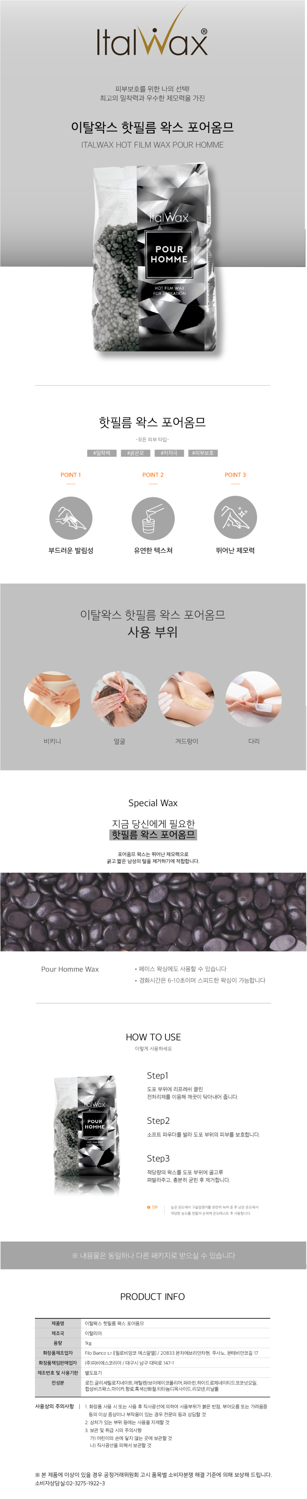 이탈왁스 핫필름 왁스 포어옴므 1kg / 짧고 거친모발용