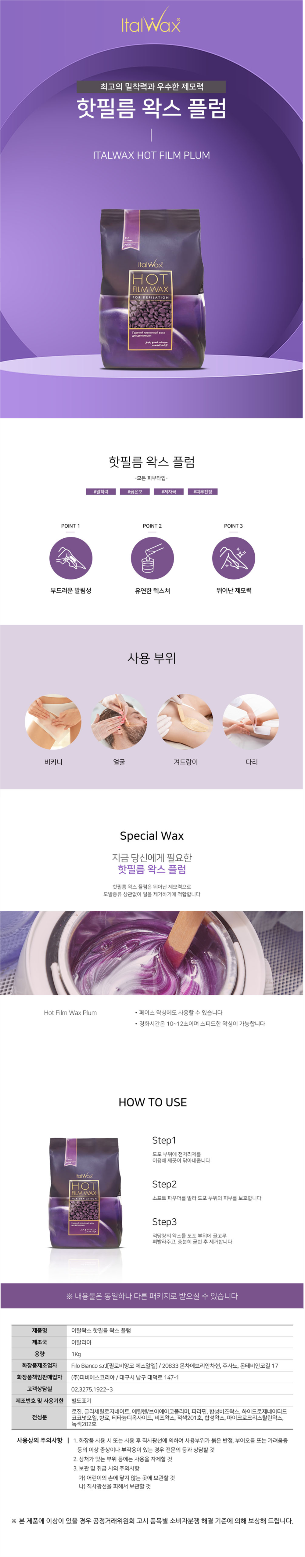 이탈왁스 핫필름 왁스 플럼 1kg / 짧고 거친모발용